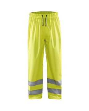 Sadehousut huomiovarilla tyotehtaviin, jotka vaativat kevytta ja pehmeaa sadevaatetta. Tuulen- ja vedenpitava, liimatut saumat. Joustava resori ja kiristysnauha vyotarolla, saadettavat lahkeensuut neppareilla. Sertifioitu EN 343 (suojaus sateelta) ja EN ISO 20471, luokka 2 (nakyva varoitusvaatetus ammattikayttoon).