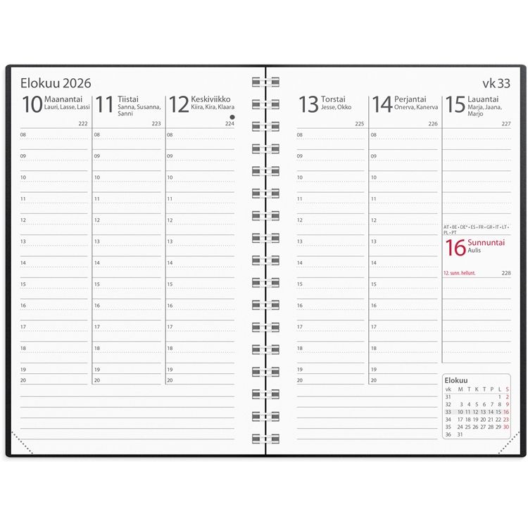 Burden Exclusive on pienikokoinen kalenteri, jonka aukeamalla on yksi viikko 08-20 tuntijaotuksella, kuluvan kuukauden kalenteritaulukko ja muistiinpanotilaa. Mukana tulee musta muovikansio, joka sisältää kalenterin ja erillisen muistilehtiön.