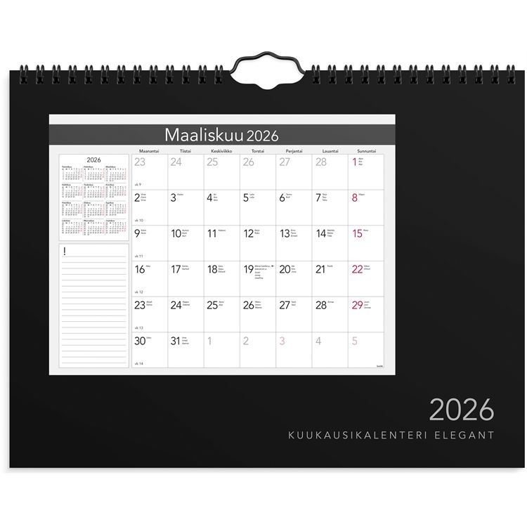 Burden Kuukausikalenteri Elegant -seinäkalenterissa vuodelle 2026 on paljon tilaa muistiinpanoille. Yhdellä sivulla on kuukausi ja joka kuukaudella muistiinpanotilaa ja vuosiruudukko. Kalenteri sisältää nimipäivät, juhlapyhät ja liputuspäivät.